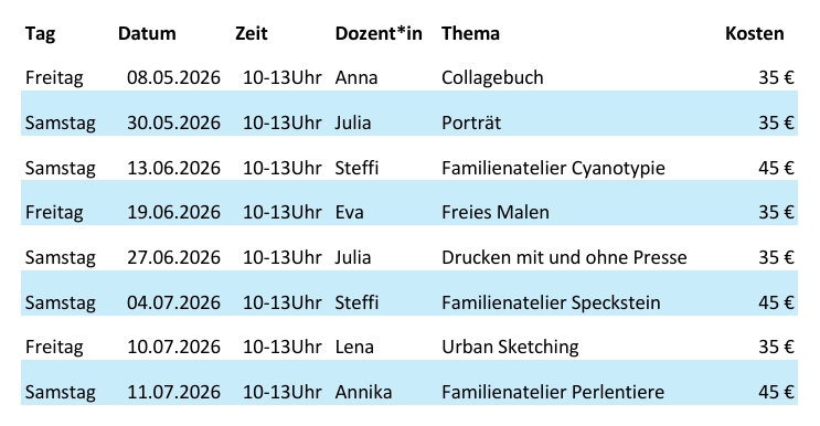 Wöchentlich finden rund 20 Kunstkurse in unserem Atelier im Luftschiff statt. Unser Atelier lädt dazu ein, dem Alltag zu entfliehen und in eine ganz eigene kreative Welt einzutauchen.