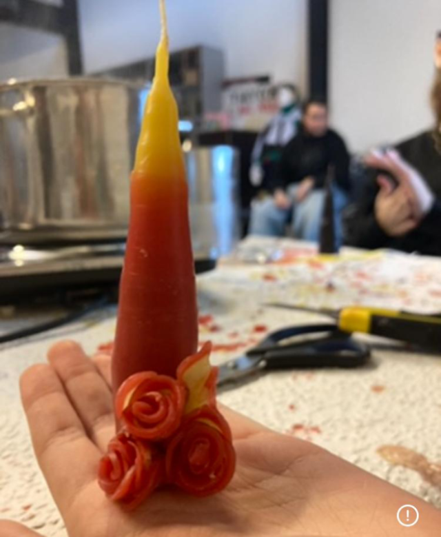 Ihr seid eingeladen, eure eigenen Kerzen zu ziehen. Duftender (Bienen)Wachs wird geschmolzen, der Docht getaucht und so entsteht schichtweise und nach alter Tradition eine handgemachte Kerze.
